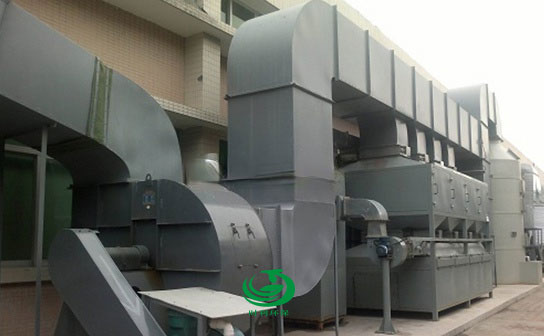 主要由催化燃烧床(由电加热室、催化室和热交换器组成)、阻火器、温度探测器和相应的电动阀门、保温管道组成。主要功能是利用催化燃烧床中电加热器来加热生产线产生的废气,使其中的有机废气在催化剂的作用下于280-300℃左右转化为CO2和H2O并释放出大量热量。热量通过热交换器对热量再利用。