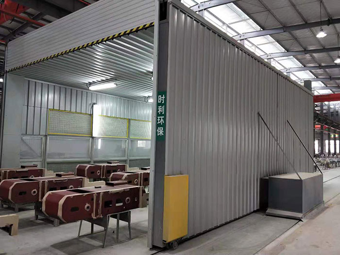 整体移动房移动到位→喷漆→管道→干式漆雾净化器→活性炭设备有机废气设备→风机→出风管道(15m排放)