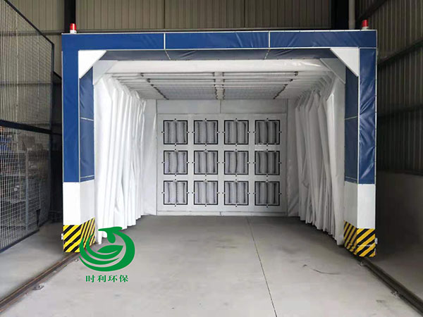 3、环保伸缩喷漆房整体为框架传动结构,每组框架间均有阻燃PVC布密封连接,安装快捷、外形美观,结构精巧,使用方便,制造成本低,节约投资;
